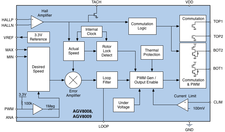 The AGV8009 is a full featured single phase brushless DC fan/motor pre-driver. Closed loop feedback allows for precise control of the motor's RPM under varying supply and load conditions. Maximum RPM is programmable via an RC time constant. Precise variable speed is adjusted by varying the duty cycle to the PWM control input pin. Minimum RPM is programmable via a resistor divider to Vref. The analog control pin can be used to interface with a thermistor when the PWM input control is not needed. Soft start reduces inrush current at power on. Soft switching reduces audible noise. Current limit, locked rotor and thermal protections are also provided. The 40V MOS output predrivers can source or sink 100mA.